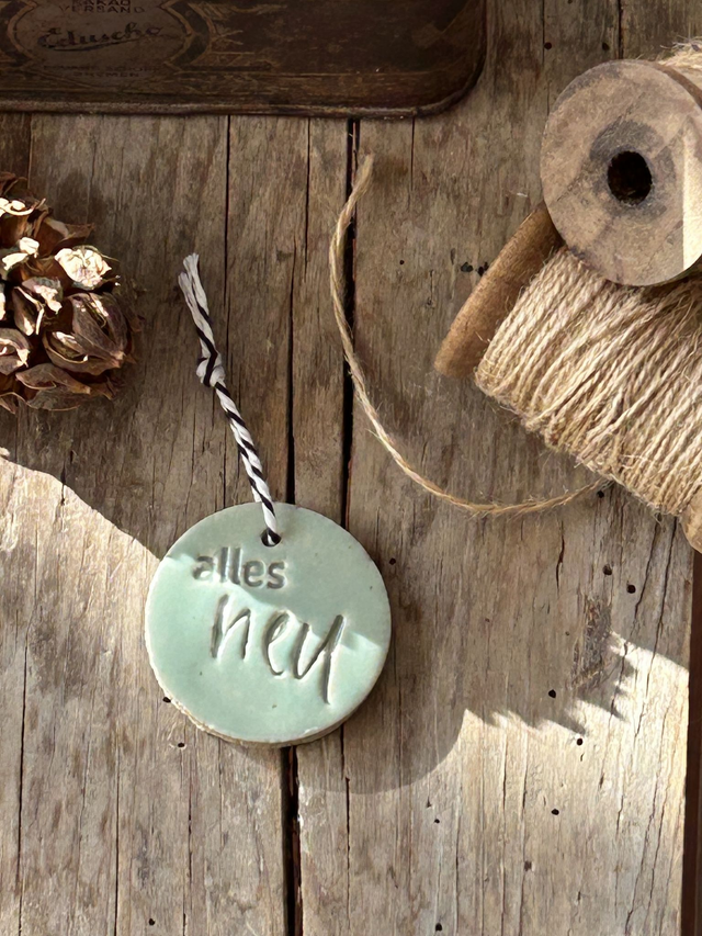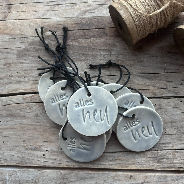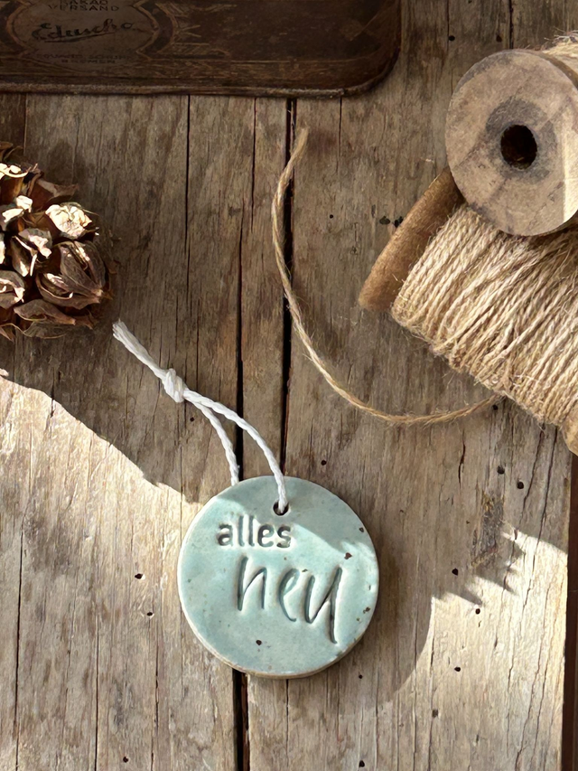 1. Emblem-Anhänger "alles Neu" mit Loch und Schnur